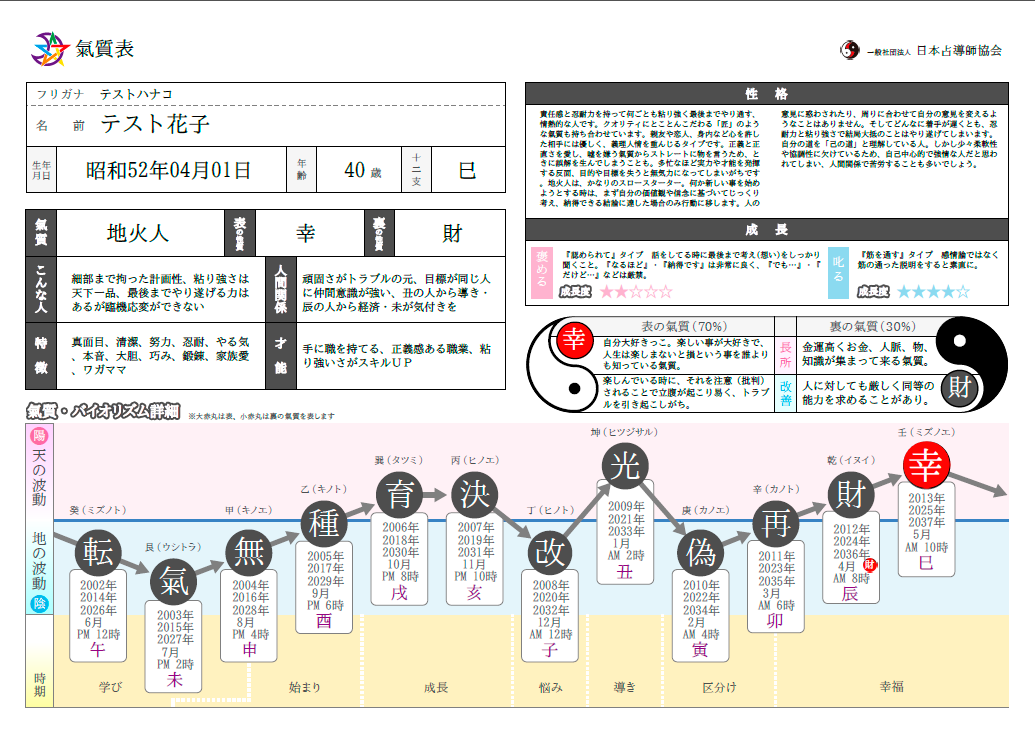 生年月日から、あなたの生まれ持った氣質(性格・性質)を導き出し、自分をどう活かしていったら良いかをアドバイスいたします。